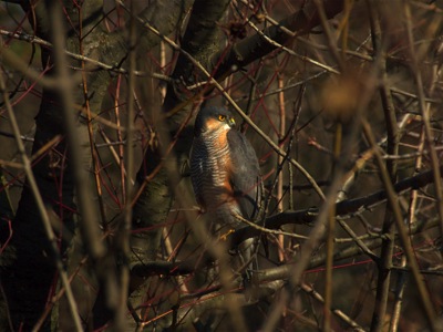 Egész héten verőfényes napsütésben dolgoztam – a négy fal között. Szombat reggel, mivel két órára nem lett volna érdemes kimennem a homoktövis élőhelykezelésre, a lest választottam. Zoli és Imre remekül sikerült ökörszem fotója inspirált, szerettem volna én is lencsevégre kapni kis kedvencemet. 8 óra után értem fel, nagy mozgás fogadott, a szokásos három cinegefaj közel harminc egyede sürgött-forgott az etető körül. Távolról egy tojó fenyőpinty is mutatkozott, de ökörszem sehol. 10 óra körül, már éppen szedelőzködtem, mikor riasztásra lettem figyelmes, balról egy karvaly húzott át, és legnagyobb örömömre beült egy közeli cseresznyefa ágára. Sajnos elég messze és takarásban is volt, de azért szorgosan kattintgattam az ágak közt kukucskálva. A cinegék persze lármáztak folyamatosan hím karvalyra. Aztán egyszer csak elrúgta magát, gondoltam – ennyi volt …